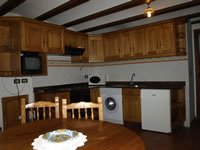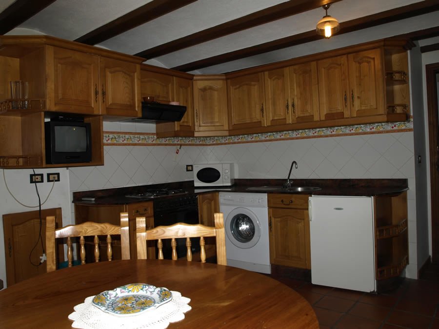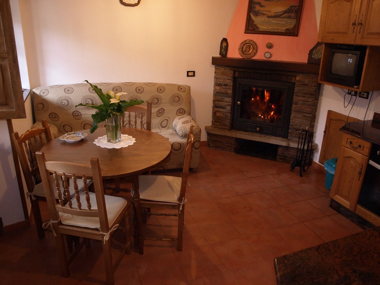 En la planta inferior, que aloja el baño y la cocina-salón se ha optado por un estilo más moderno, pero respetando la decoración típica de las casas de la zona, con una chimenea que dota a la estancia principal de un acogedor calor hogareño. Se ha completado la cocina-salón con el típico escaño ( escano ) de madera en torno a la mesa, como en las casas de antaño, donde los campesinos se reunían en las noches de invierno a charlar o jugar a las cartas.